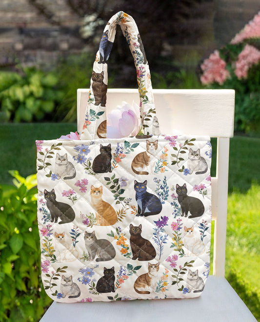 Cat Lover Quilted Tote Bag Charming Floral Cats