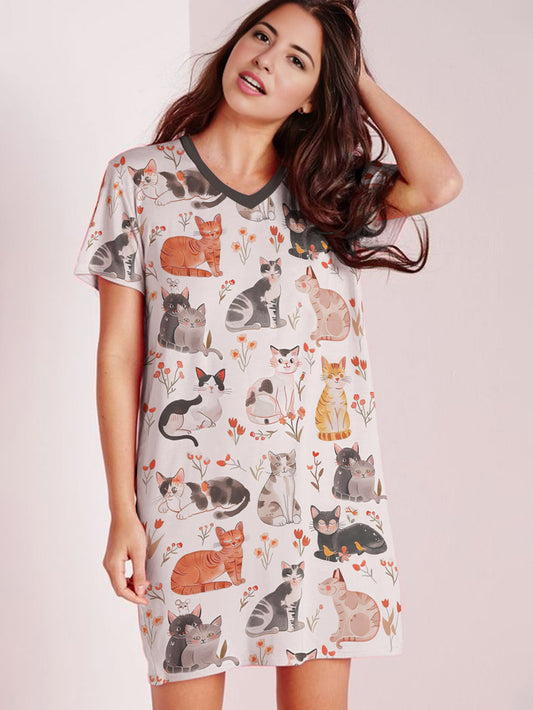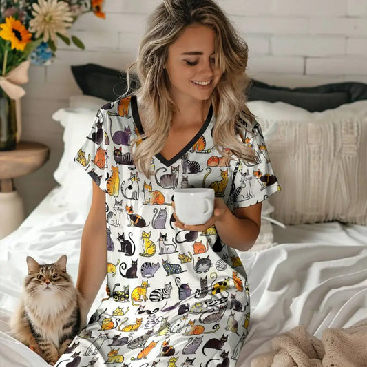 Cat Lover V-neck Nightshirt Colorful Kitty Parade