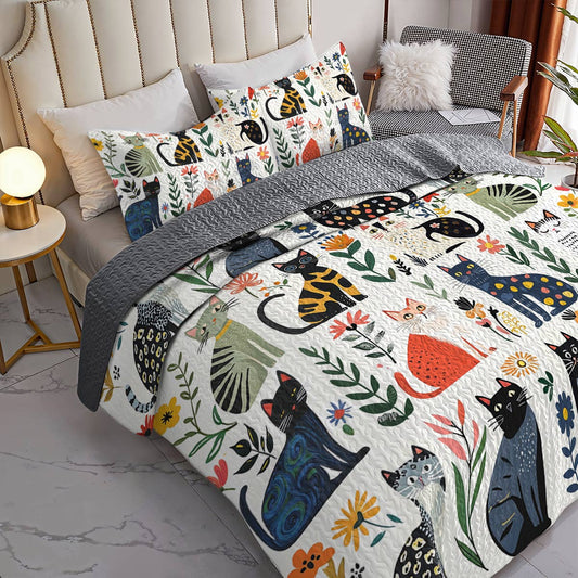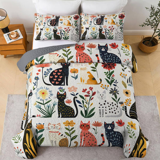 Cat All Season Quilt 3-Piece Set Whimsical Floral Cats