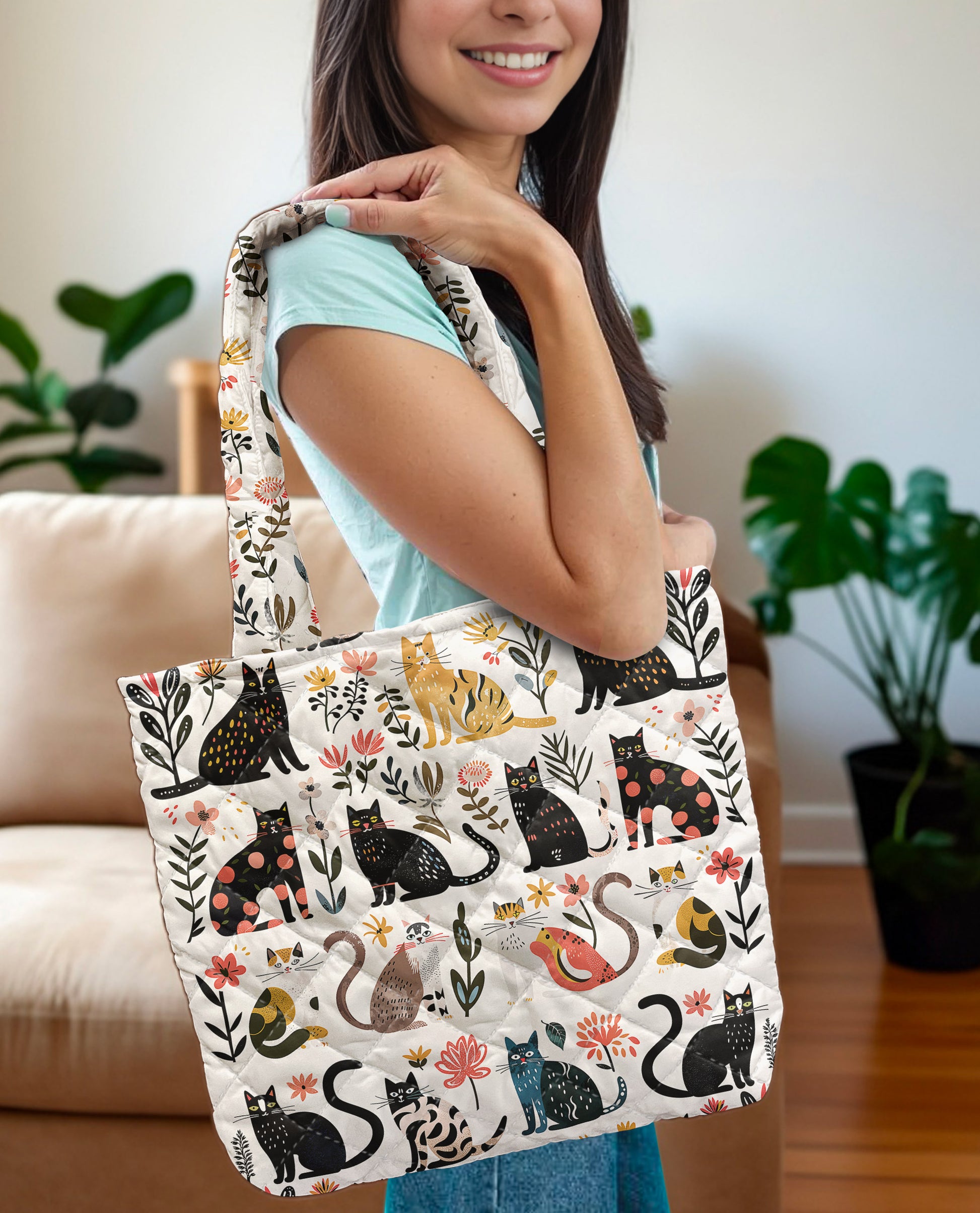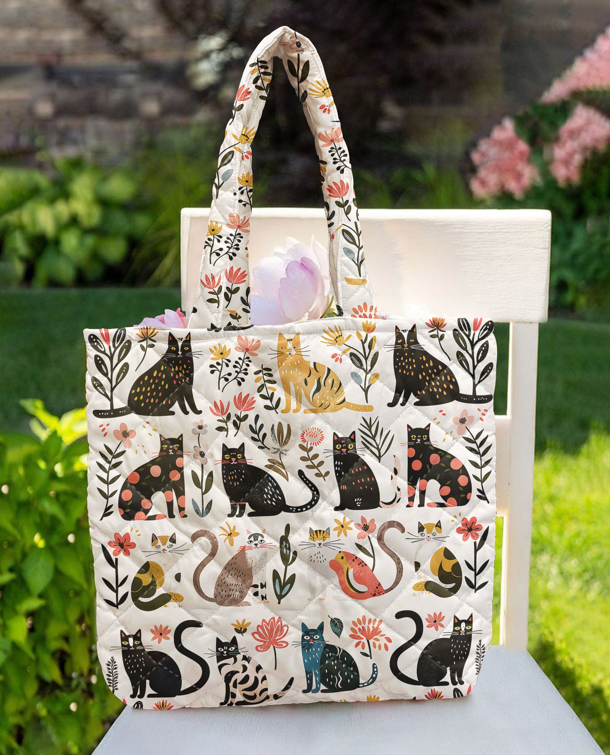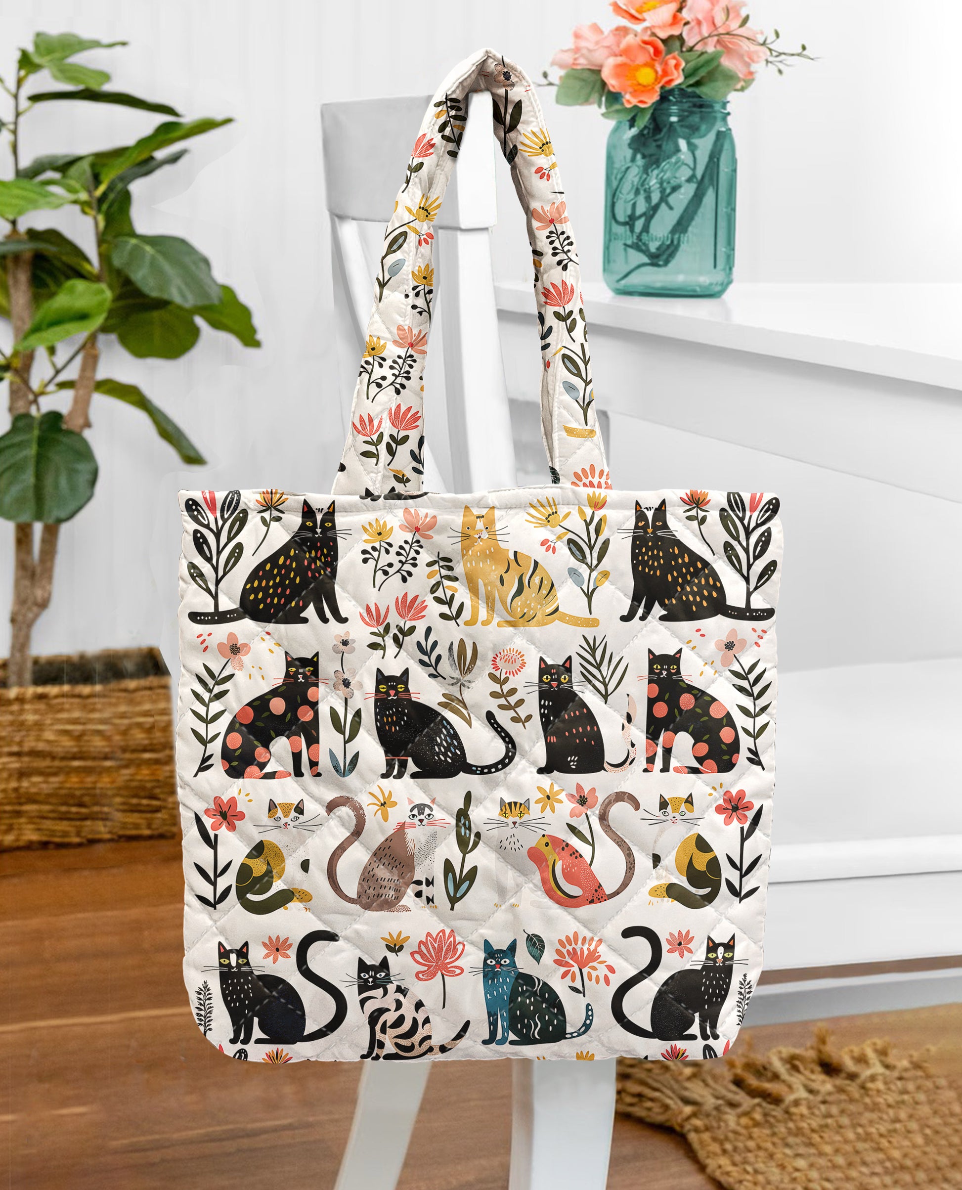 Cat Lover Quilted Tote Bag Botanical Cat Bliss