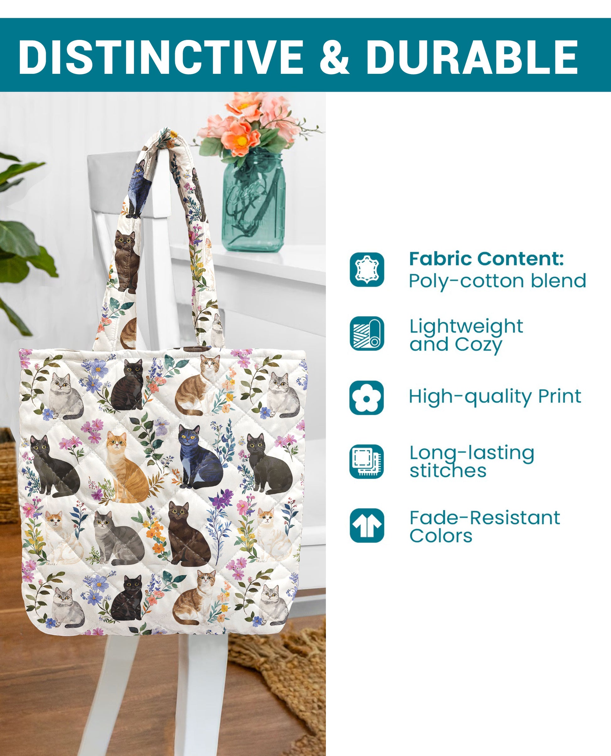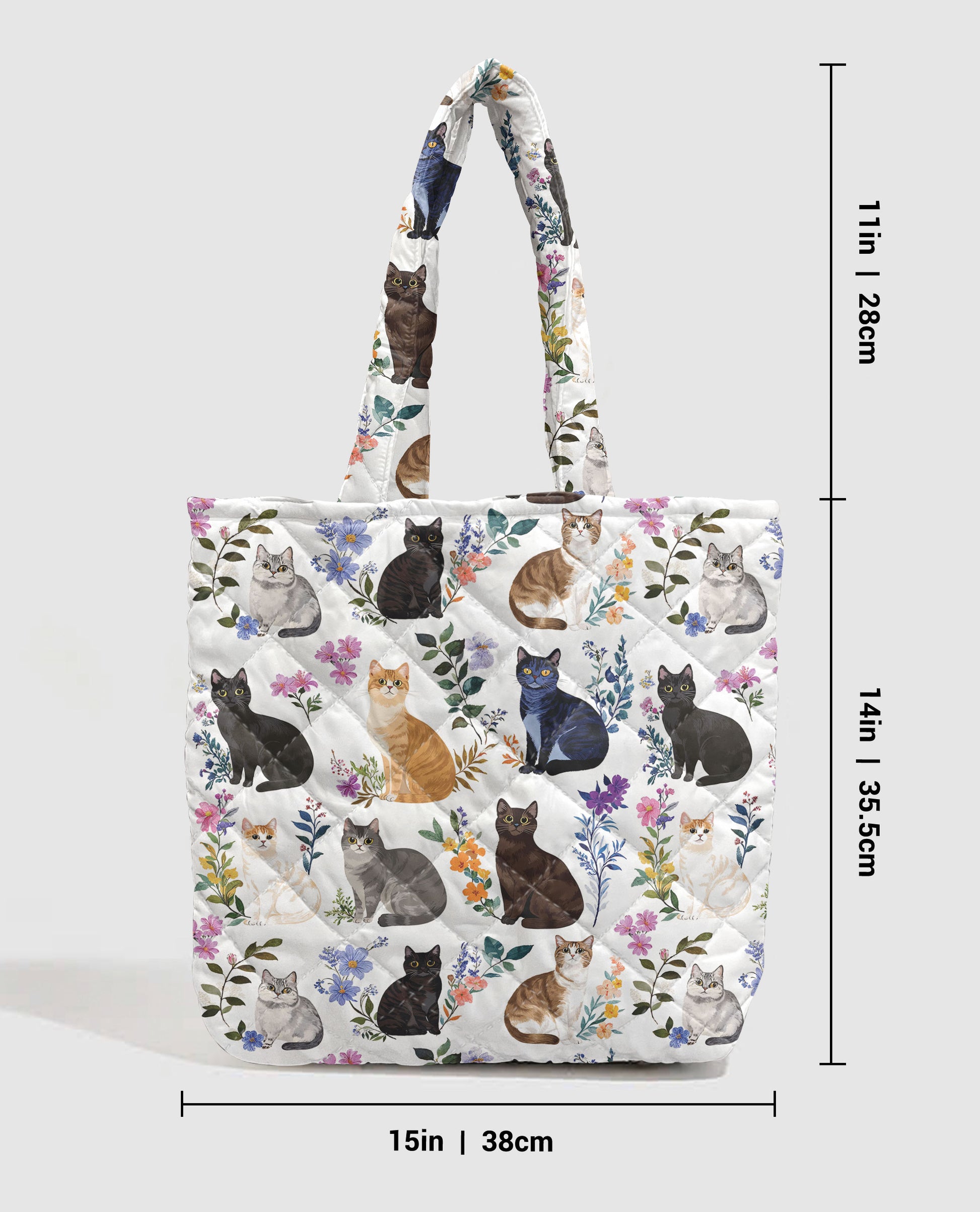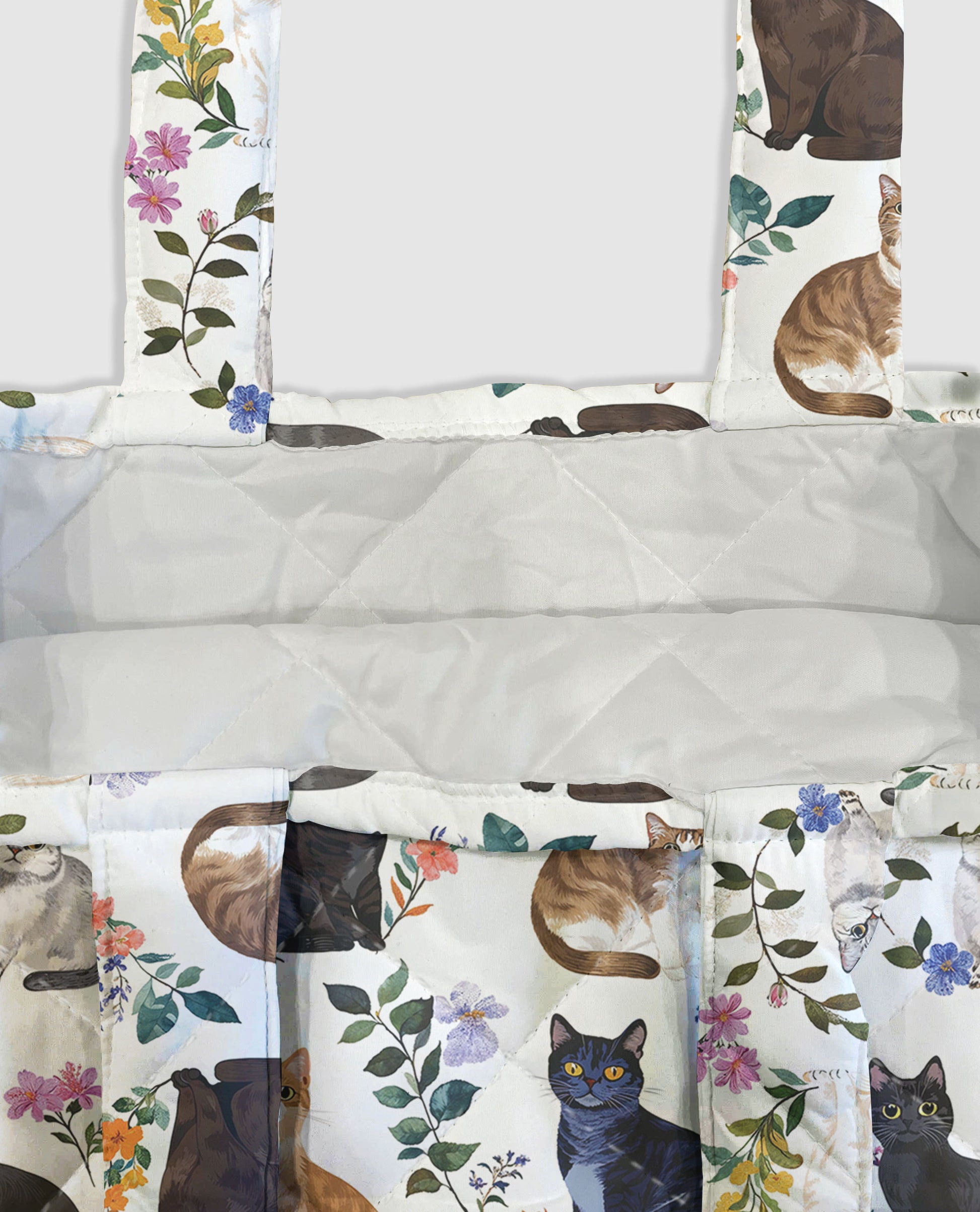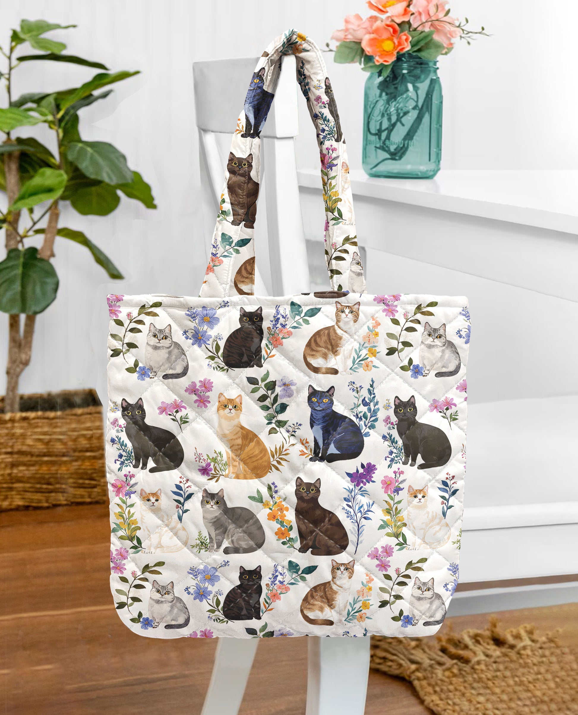 Cat Lover Quilted Tote Bag Charming Floral Cats