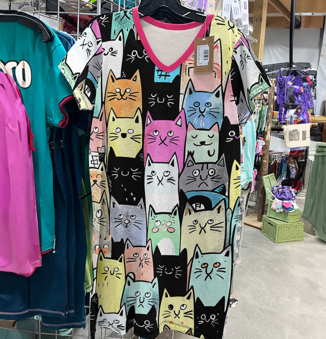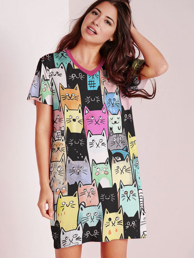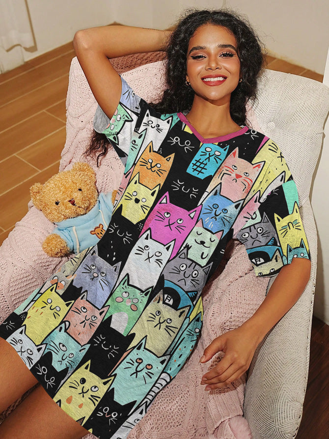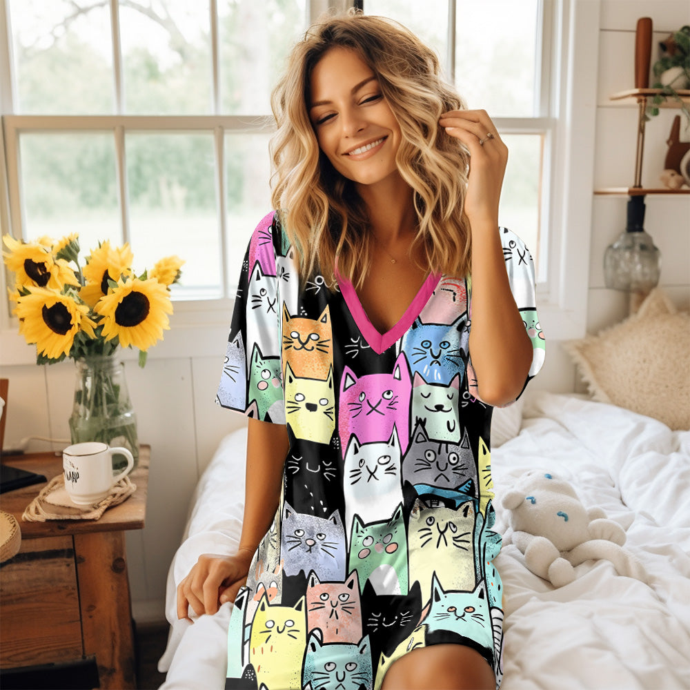 Cat Lover V-neck Nightshirt Colorful Kitty Parade